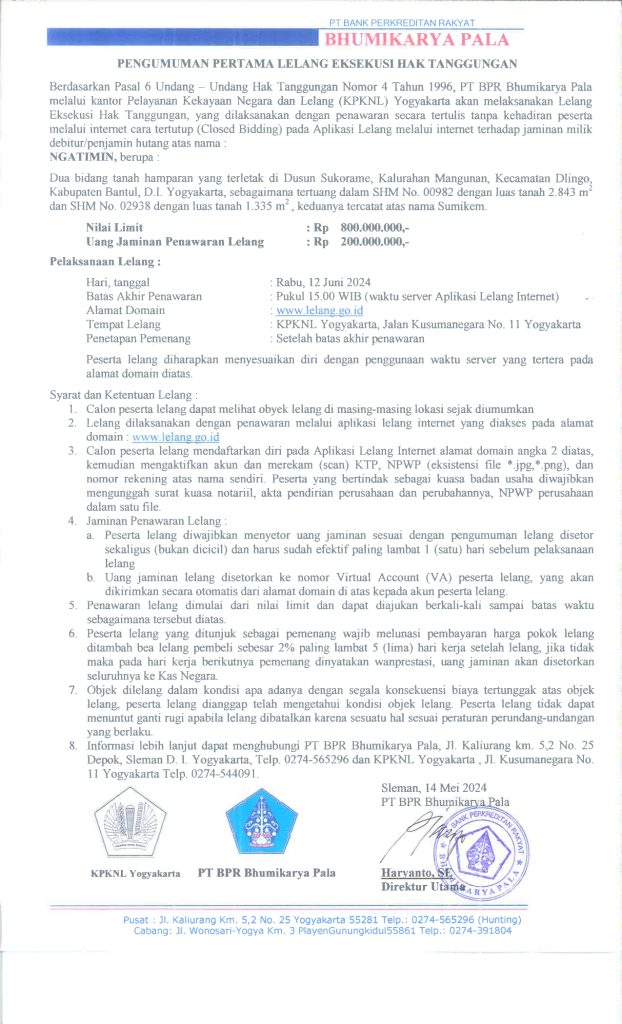 - Informasi lebih lanjut dapat menghubungi PT BPR Bhumikarya Pala, Jl. Kaliurang km. 5,2 No. 25 Depok, Sleman D. I. Yogyakarta, Telp. 0274-565296 dan KPKNL Yogyakarta , Jl. Kusumanegara No. 11Yogyakarta Telp. 0274-544091.