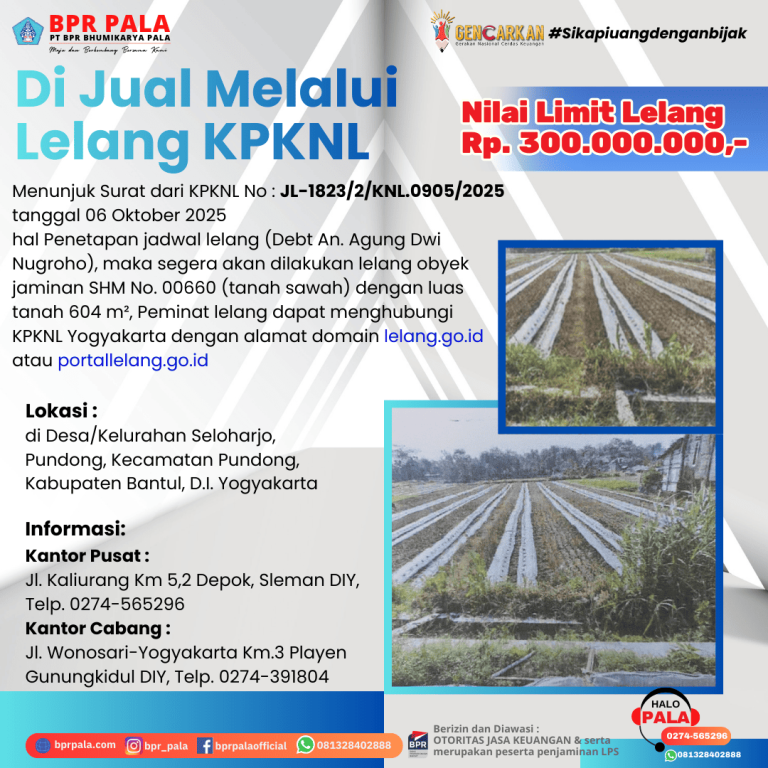 Di Jual Melalui Lelang KPKNL • Sebidang tanah sawah untuk pertanian yang terletak di Desa/Kelurahan Seloharjo, Pundong, Kecamatan Pundong, Kabupaten Bantul, D.I. Yogyakarta, sebagaimana tertuang dalam SHM No. 00660 dengan luas tanah 604 m2 tercatat atas nama SURONO.